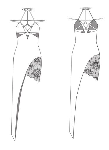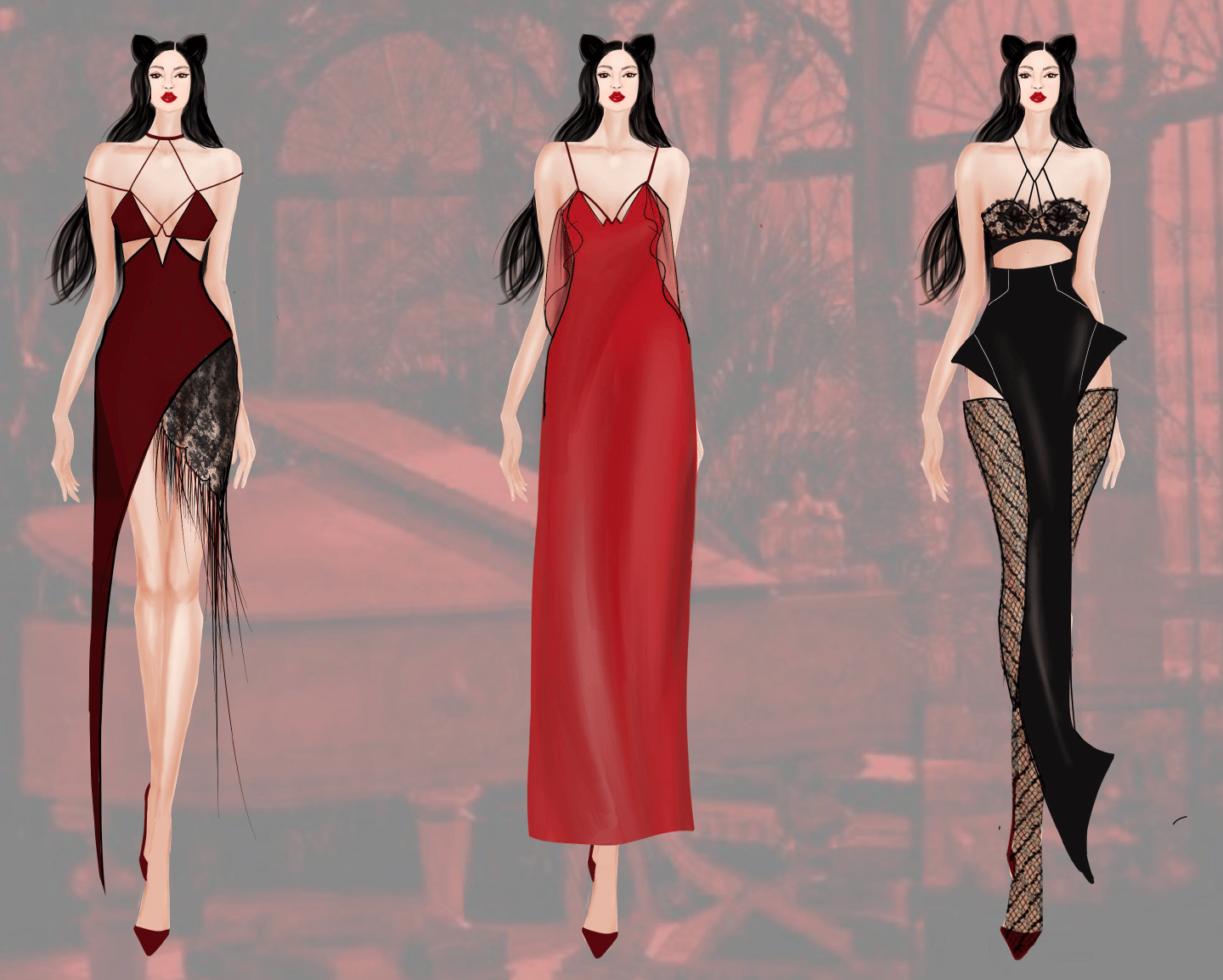 explores the transition from intimate lingerie to powerful eveningwear. Using lace, chiffon, and sheer mesh in a striking red and black palette, the collection highlights sensuality, transparency, and the evolving strength of femininity.