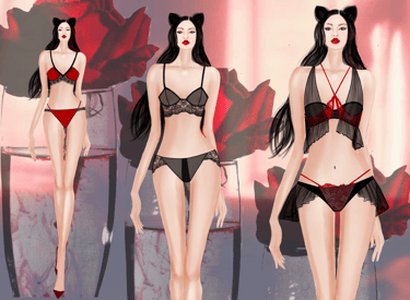 transitions from lingerie to eveningwear with a striking red and black palette, highlighting sensuality and femininity.