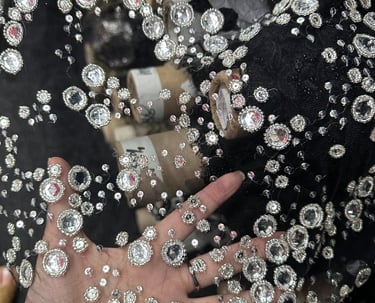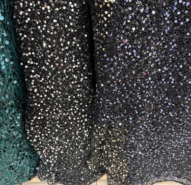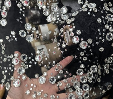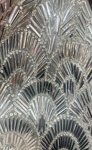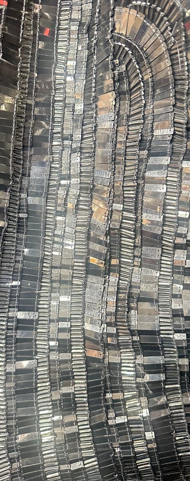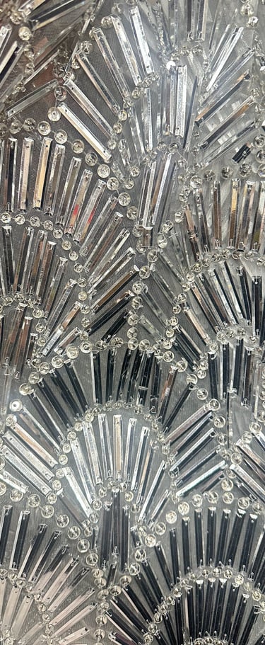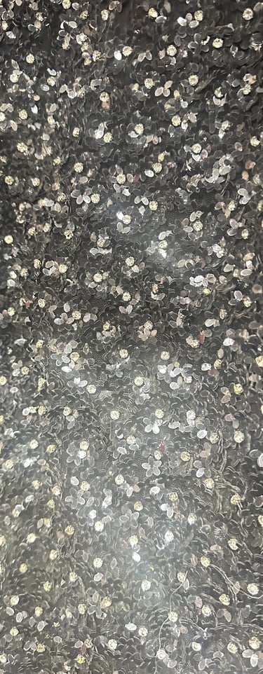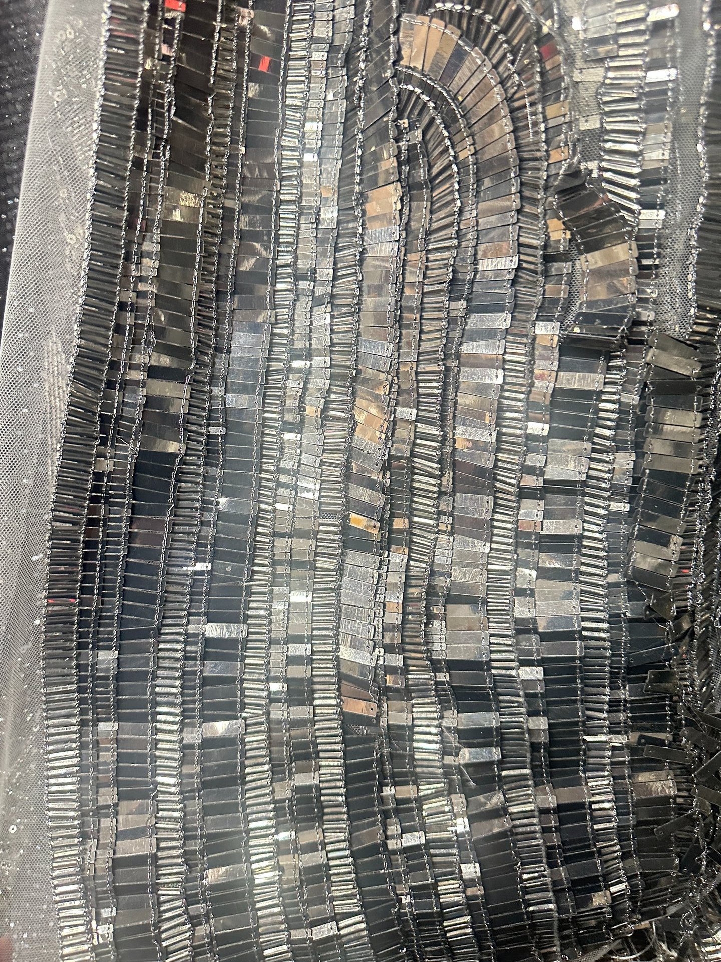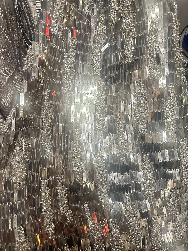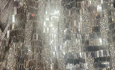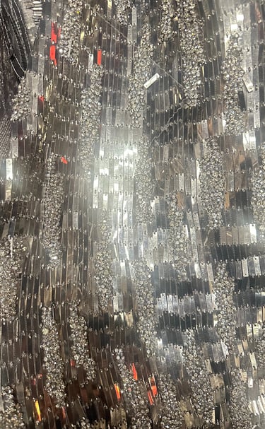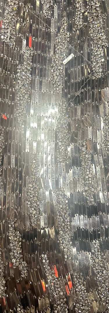 SPECIAL FABRIC, METALLIC EMBROIDERED, RECTANGULAR SEQUINS THAT MIMIC A MIRROR EFFECT